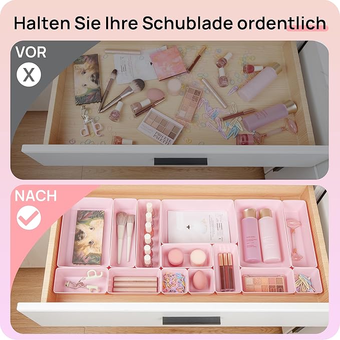 - 【Make Everything Organized】These clear versatile drawer dividers trays are perfect for any place in your home. Fit all kinds of drawers, such as vanity / bathroom / kitchen / office drawers/ craft room, ideal for organizing cosmetics, makeup tools, hair accessories, jewelry, pins, office supply, craft supplies, utensils, etc.