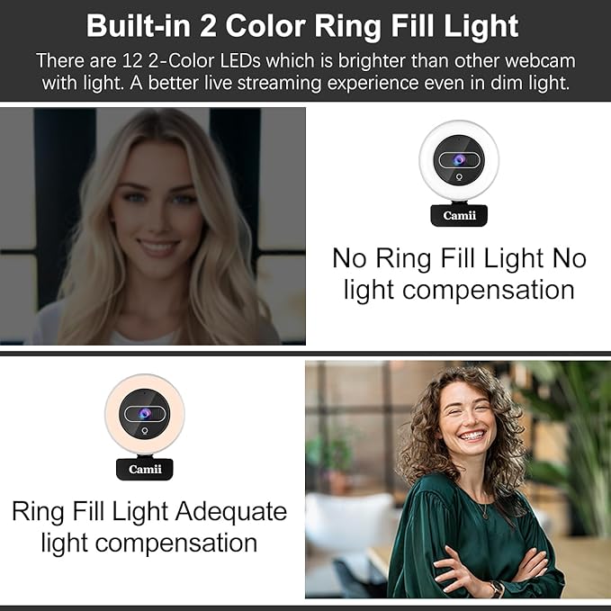 - [Two Colours & Three Levels of Adjustable Lighting]: The Camii 4K webcam has a built-in light that supports two colours and three levels of brightness for lighting options. Different lighting effects can be achieved by touch control or remote control. Even in dimly lit lighting environments, the monitor camera can help illuminate your scene without glare.
