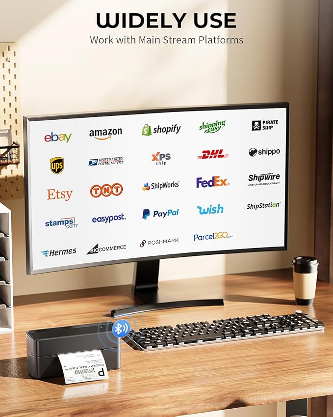 - 【 Wide Platform Compatibility 】241BT usps label printer is compatible with major transportation and sales platforms such as usps, UPS, eBay, FedEx, Amazon, Shopify, Etsy, and PayPal. The ideal label printer for small business transportation - easily edit and print text, barcodes, QR codes, tables, etc. online, and can also directly import WORD/TXT/PDF files for printing. Note: The printer only supports black-and-white printing. For color labels, please purchase compatible thermal color label paper separately