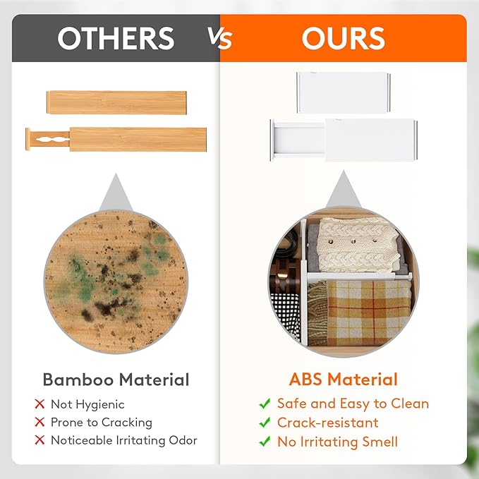 - Advanced Design: Our dresser organizer is made from stable ABS material and has high-quality EVA foam sponges at the ends to prevent scratches and damage to drawer walls, leaving no trace or residue. Additionally, our divider is patented (Patent No: US12133593B2) for a unique experience.