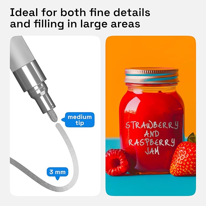 - Multiple Surfaces: Use these oil paint pens as oil markers for plastic and glass or as oil based fabric markers for clothes. Each silver paint pen is water-resistant. They’re also good for leather, vinyl, or epoxy resin. And the nibs are solid, even on rocks!