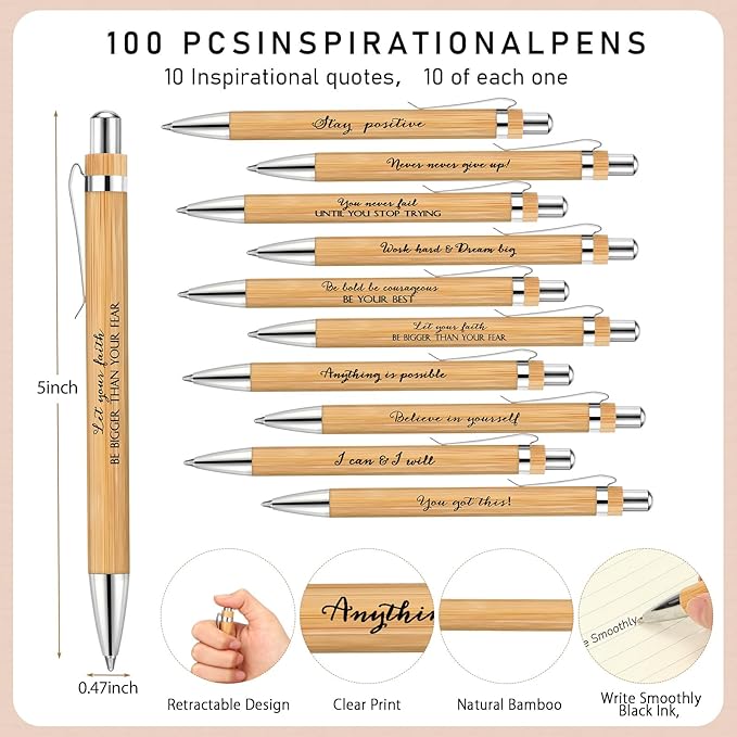- Appreciation Gifts Bulk: you will receive 100 pcs of motivational spiral notebooks in 10 designs, 10 pcs for each design, each equipped with sticky notes and index tabs, and 100 pcs of retractable bamboo pens in 10 designs, 10 pcs for each design, enough quantity to satisfy your daily use and sharing needs