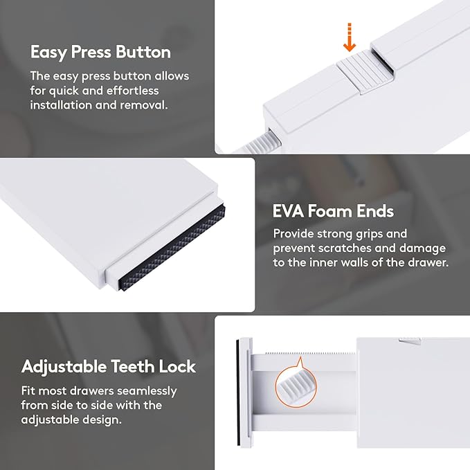 - Easy to Install: To adjust the length, press the top button before placing the drawer organizer, and then stretch it out again to secure it tightly. The strong spring tension keeps each organizer upright and secure. When retracting, press the top button and push in the stretched side.