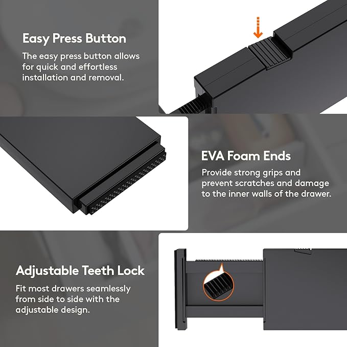 - Easy to Install: To adjust the length, press the top button before placing the drawer organizer, and then stretch it out again to secure it tightly. The strong spring tension keeps each organizer upright and secure. When retracting, press the top button and push in the stretched side.