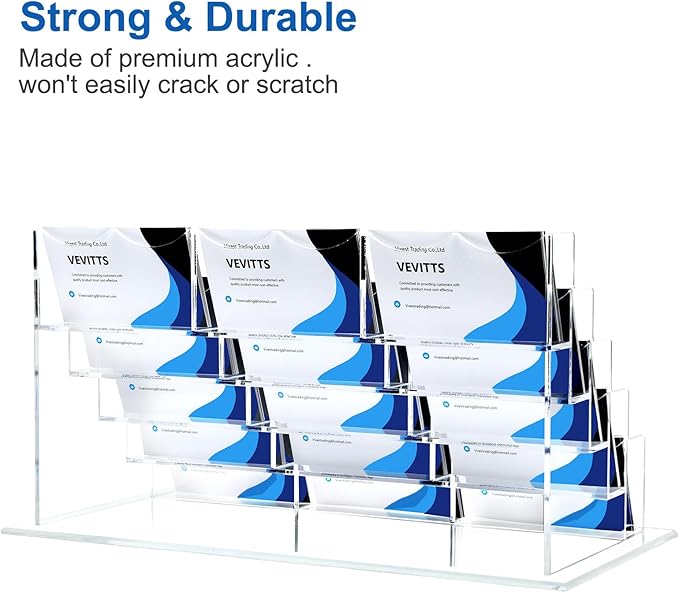 - STURDY CARD STAND - This acrylic desktop business card holder is built to last. Measuring 12.8 inches in length, 6.8 inches in width, and 6.4 inches in height,5 tiers 15 pockets, it can sit securely on any counter or desktop. This make it perfect for a variety of settings, including small businesses, individual departments, reception desks, and trade shows.