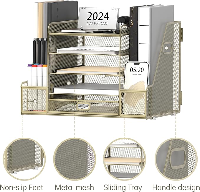 - [Comprehensive Desk Organizer] This desk organizer comes with 4 sliding trays, 2 vertical magazine racks, 2 pen holders and 1 sliding drawer. Equipped with such a complete desk organizer, it is definitely your first choice for office accessories!