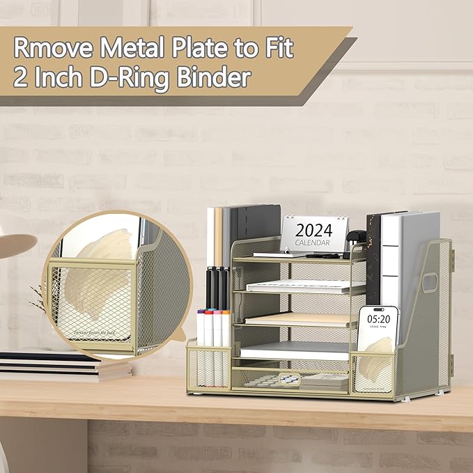 - [Large Capacity File Organizer] This desktop organizer has five tiers, each of which has a lot of space. There is also a lot of space on both sides of the file organizer, as well as the pen holders and drawer, a large file container that can hold books, notebooks, a4 paper, and other small items is ideal for organizing files.