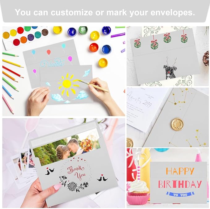 - Design: This 5x7 envelope is very suitable for 5x7 cards/photos. These envelopes are also very suitable for direct mail, letters, postcards, weddings, birthdays, baby showers, graduations, holidays, handmade cards, business, and various party invitation cards. So you can rely on them to meet all your special mailing needs.