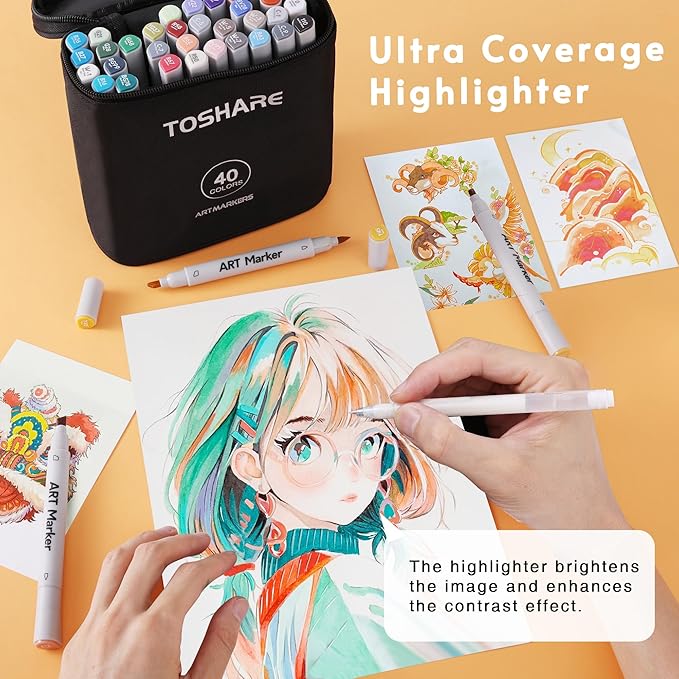 - [ 40 Vibrant Colors + 1 Highlighter Markers ] - Toshare Art Dual Tip Markers come with 40 brilliant colors and 1 multi-functional highlighter pen.Explore the full range of color with 40 dazzling shades to choose from, complemented by a highlighter pen for easy to brighten up the details of the picture,Whether you're filling a coloring book or creating a professional masterpiece, our brush markers will bring your work to life with every stroke.