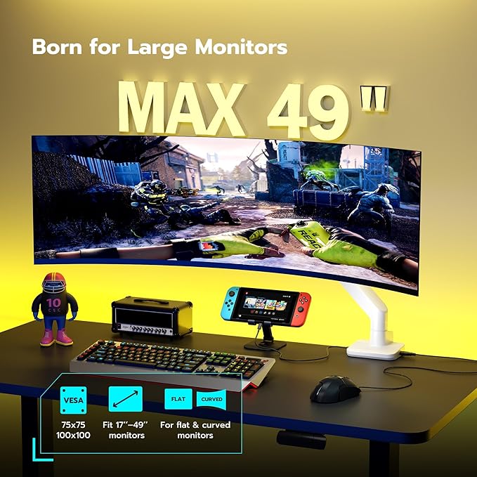 - 【Support up to 49" & 44lbs Monitors】The ARES WING single monitor arm has an optimized tilt structure, provides excellent weight-bearing capacity for ultra wide screens, including most of the popular 49" ultrawide flat and curved computer monitors. With a max. weight capacity of 44 lbs, it can securely support 17"-49" monitor, and compatible with VESA 100x100 and 75x75mm. If your monitor does not have a VESA hole, you need to prepare a VESA mount adapter.