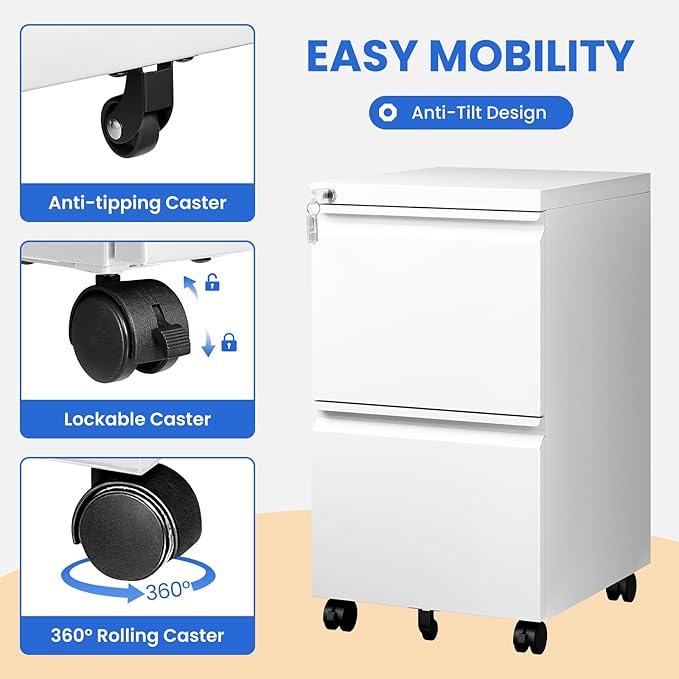 - 【Mobile File Cabinet 】: Equipped with 2 lockable casters + 2 x 360° swivel casters + 1x anti-tilt wheel, you can move this filing cabinet easily. 360° swivel casters go to any direction easily, while lockable casters offer braking and the center support wheel prevents tipping.