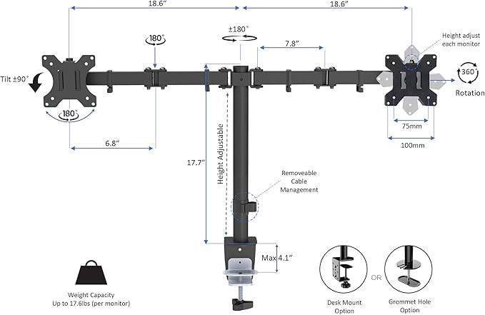 - Standing Desk Converter Bundle includes 40" desk riser (R DADRB-40-ACUSB) and Dual Monitor Arm (R DM2) for easy ergonomic positioning of 13"-27" flat panel monitors to optimize viewing comfort. R DM2 includes a grommet mount to install.