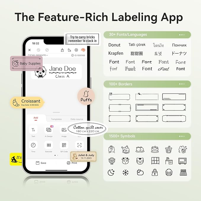 - 【Label Options and Organization】With Intelligent Identification technology, this mini label maker can automatically recognize the label you put in, support a variety size and kind of label paper, such as clear, colorful, cute gift tapes and round labels. The label refills is waterproof and Oil-proof, which can be widely used in Home Kitchen and School. (This label maker is monochrome printout, which only prints black text. We can create color labels buy using color pattern label tapes.)