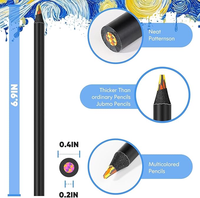 - Jumbo Coloring Pencils: Crafted from resilient ebony wood, our rainbow color pencils stand strong against breakage. Setting them apart from conventional options, these pencils feature a generously thick core, measuring 0.2 inches in diameter, much thicker than others. This enhanced core durability ensures a longer lifespan, while the 0.39-inch broader shaft of the pencil enhances your grip, providing optimal control for your artistic endeavors.