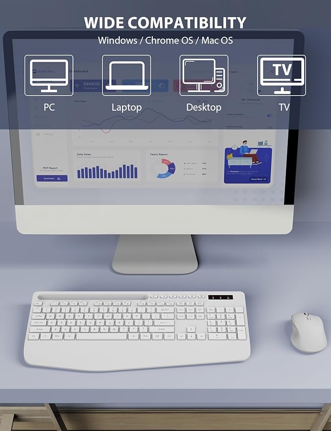 - BUILT FOR COMFORT - Ergonomic keyboard designed with a generous palm rest and tilt legs, offers a better typing position to reduce the pressure on your wrist. The wireless mouse provides total comfort with a perfect handshake angle, contoured grips and premium matte finish.