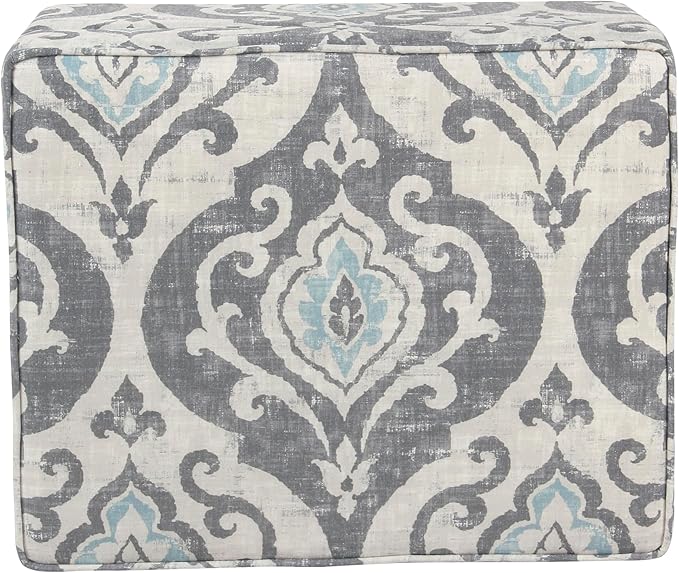 - STORAGE OTTOMAN: Featuring a hinged lid, our Blue and Gray Damask Fabric Storage Ottoman is designed with function and fashion in mind | Perfectly completed with tapered wood legs in a gray wash finish