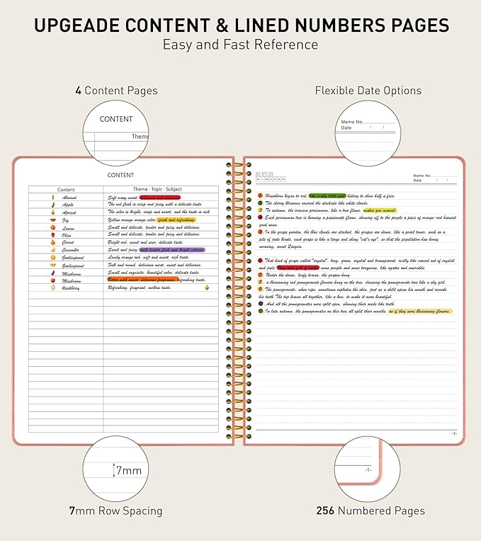 - 【Upgrade Spiral Journal Notebook】Our lined journal notebook is specifically designed to provide you with all the writing space you need. It includes 256 pages numbers and a 4-page blank table of contents. There is enough writing space to help you better categorize and record important matters. You can jot down important notes from various pages and note them in the front of the book for easy and fast reference. Each page has “Memo No” and “Date” header to help you keep track of the date.