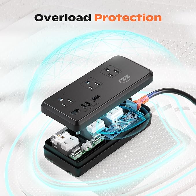 - 7-in-1 Power Strip :Features 3 AC outlets, 2 USB-C port, and 2 USB-A ports to give you everything you need to power up all of your appliances and mobile devices.USB-C: 5V 3.1A (15.5W max) USB-A: 5V 3.1A (2.4A max per port); 2 USB-A ports and 2 USB-C port share 5V 3.1A. product weight 553g