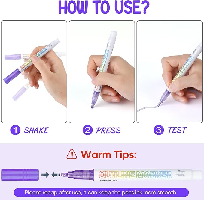 - 🎨Glitter Metallic Markers: These glitter outline markers feature a glitter metallic finish, perfect for adding eye-catching accents and highlights to your artwork or designs