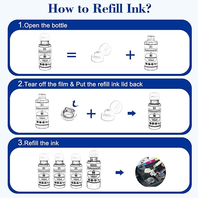 - Contents: Pristar 930 ml 31 32XL ink refill bottle set compatible with 31 32XL ink bottle set includes 165 ml 32xl Black ink x 2, 100 ml Cyan for 31 ink x 2,100 ml Magenta for 31 ink x 2,100 ml Yellow for 31 ink x 2. With a special bottle design and no-squeeze filling, our compatible ink will not leak ink or clog the printhead