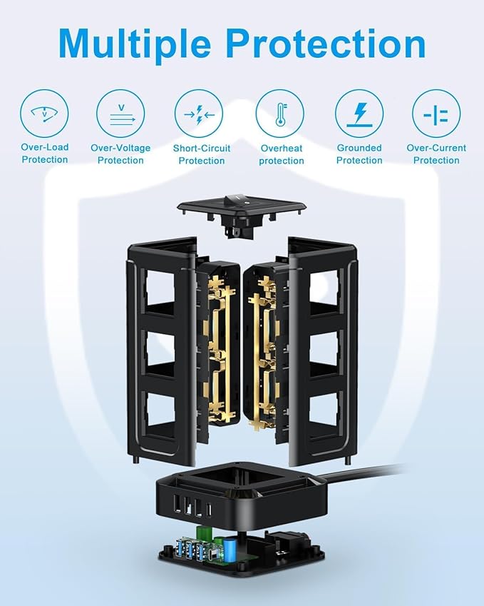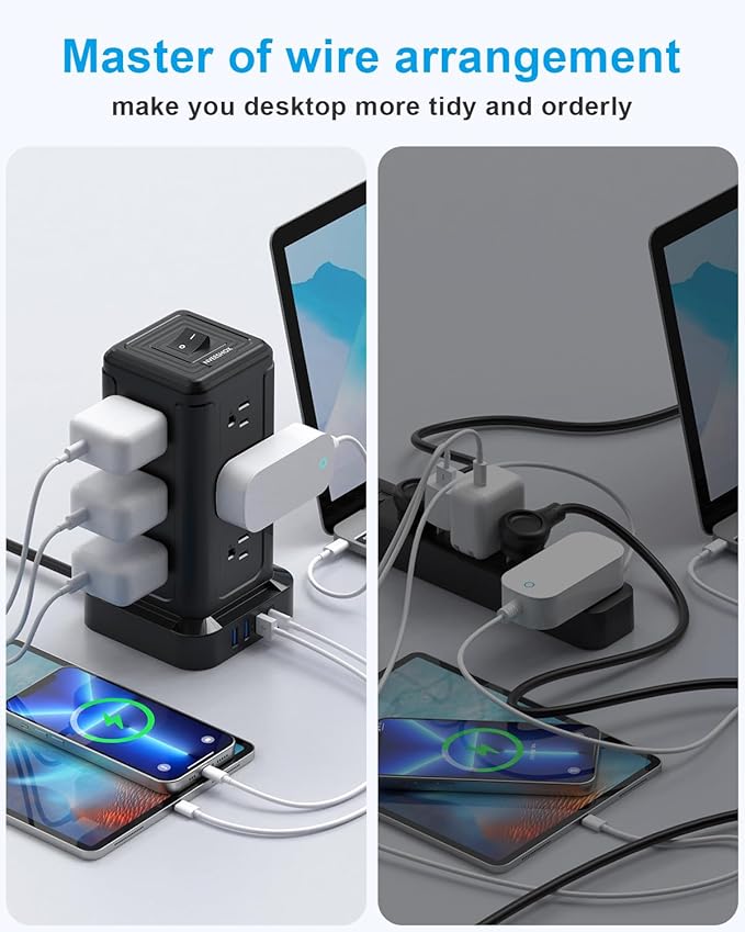 - Compact Vertical Design Flat Plug Power Strip: The flat plug power strip tower features a compact vertical design with 2 inches of space between power ports on all four sides. This wider spacing accommodates plugs of all sizes without blocking others, ensuring a compact and space-saving solution.