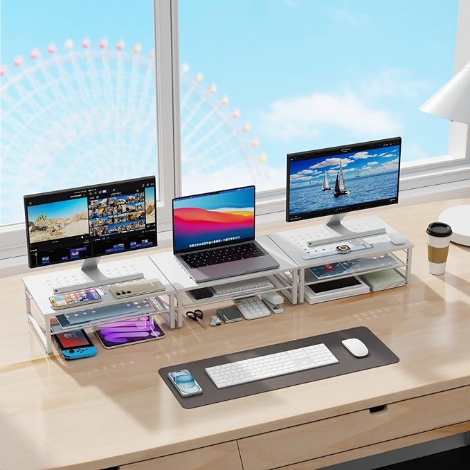 - 【Broad Compatibility】: The monitor stand riser has a universal size design that is compatible with printers, computers, Telephone and laptops. It features a ventilated design to prevent overheating. The non-slip rubber pads provide stability during use.