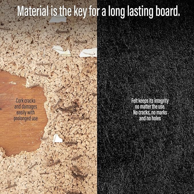 - LIGHTWEIGHT, DURABLE & PIN-FRIENDLY – Crafted from high-quality polyester fiber, our large felt board is lightweight yet sturdy. The 0.35-inch thick surface holds push pins tightly, resists wear, and self-heals over time, making it the ultimate cork board for long-term use.