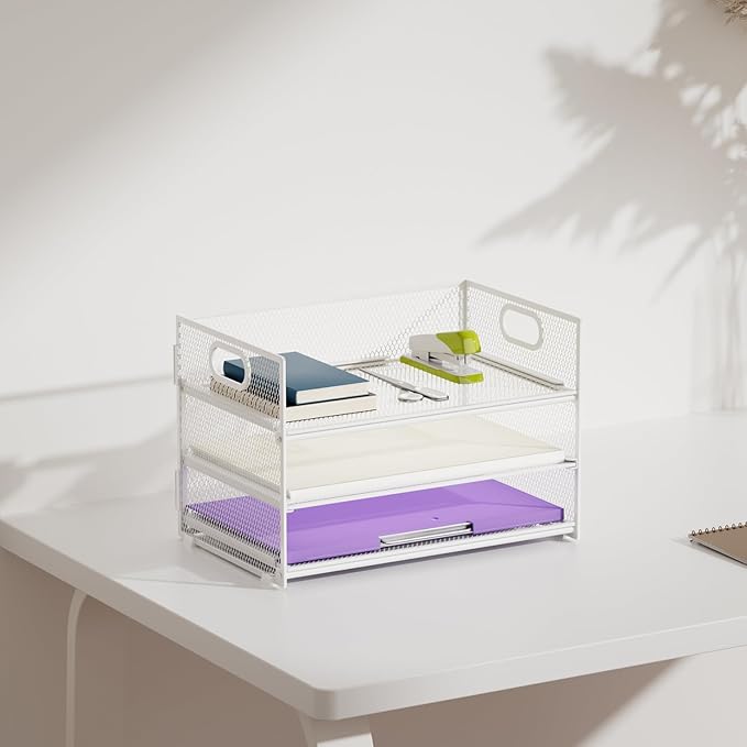 Marbrasse 3 Tier Paper Organizer Letter Tray, Mesh File Organizer with Handle, Paper Sorter Desk Organizer for Home Office Supplies(White)