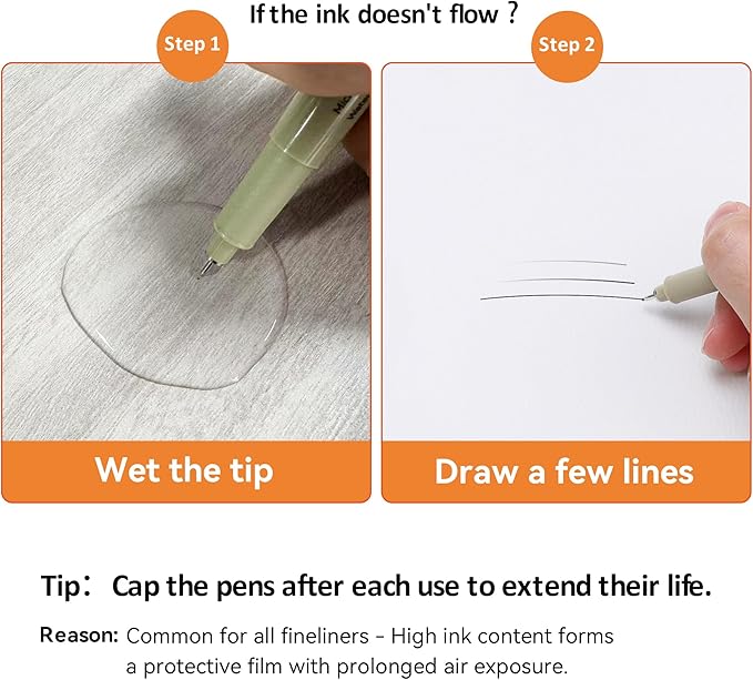 - Cap Pens After Use:XWT micro pens have a high ink content. Avoid leaving the artist pens exposed to air for a long time, as this can cause the tip to develop a protective film — a common reason why all fineliner pens may stop writing.❤❤❤ Simply WET THE TIP with a little water and draw a few lines to restore normal ink flow.