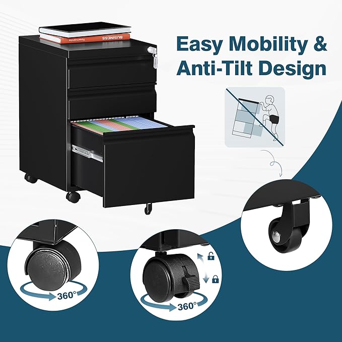 MIIIKO 3 Drawer File Cabinet on Wheels, Home Office Mobile File Cabinet Under Desk, Full Assembled Metal Filing Cabinets with Lock for Legal/Letter/A4 File Folders