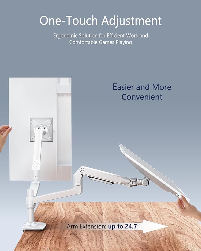 - 【Easy to Adjust】 E6 white monitor arm features a flexible movement structure, which enables instant and effortless adjustments for ideal viewing heights, more efficient than traditional monitor mounts.
