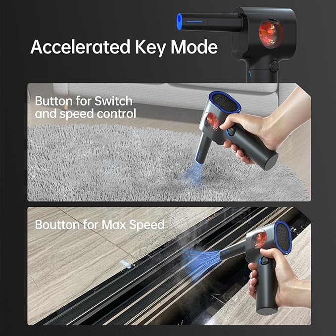 - 【Acceleration Mode】 The Rechargeable Air Duster is equipped with an acceleration button. After starting the Air Duster by turning the knob, when you want to continue to increase the wind force, just press the acceleration button to increase the wind force on the basis of the original wind force. Stop pressing the acceleration button to return to the original wind force. Combined with a brushless DC motor, it achieves higher speed and stronger wind force while maintaining stable performance.