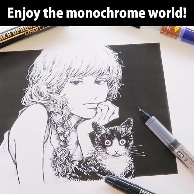 - [ZIG Cartoonist MANGAKA OPAQUE LINER] This lightfastness and opaque water-based pigment ink offers high coverage, allowing you to enjoy vivid colors stading out on dark papers. Once the ink dries, it won’t wash away with water and good for layering.