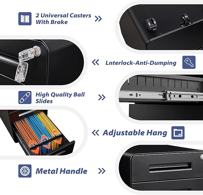- 【Interlocking System】:The anti-tilt device allows only one drawer to be opened at a time, preventing the filing cabinet from tipping forward. Furthermore, our under desk filing cabinet is equipped with a central lock, which can secure all drawers with just one key, adding an extra layer of security to your home or office.