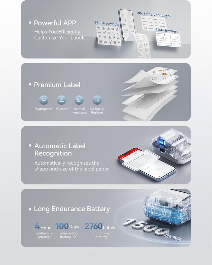- Portable and Rechargeable: The thermal label printer weighs just 293g, making it compact enough to fit in your pocket and easy to carry anywhere. It features a built-in 1500 mAh rechargeable battery, providing up to 100 days of standby time on a single charge.