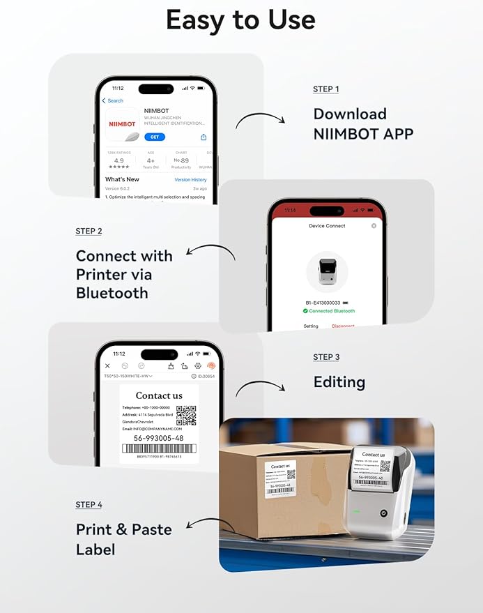 - Easy to Use: The NIIMBOT B1 Bluetooth label maker uses direct thermal printing, so there’s no need for ink or toner. It’s compatible with iOS and Android smartphones but not iPads. To use it, first install the NIIMBOT app from the Apple Store or Google Play, then connect via Bluetooth. For PC connection via USB, you’ll need to download the driver from NIIMBOT’s official website.