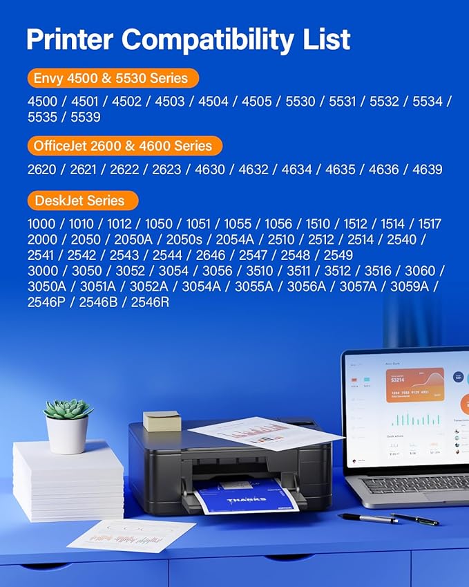 - Compatible Printer Models : (2) 2000 2050 2050A 2050s 2054A 2510 2512 2514, (3) 3000 3050 3052 3054 3056 3510 3511 3512 3516, DeskJet Series: (1) 1000 1010 1012 1050 1051 1055, HP Envy Envy 4500 & 5530 Series, HP OfficeJet 2600 & 4600 Series (2) 2000 2050 2050A 2050s 2054A 2510 2512 2514, (3) 3000 3050 3052 3054 3056 3510 3511 3512 3516, DeskJet Series: (1) 1000 1010 1012 1050 1051 1055, HP Envy Envy 4500 & 5530 Series, HP OfficeJet 2600 & 4600 Series