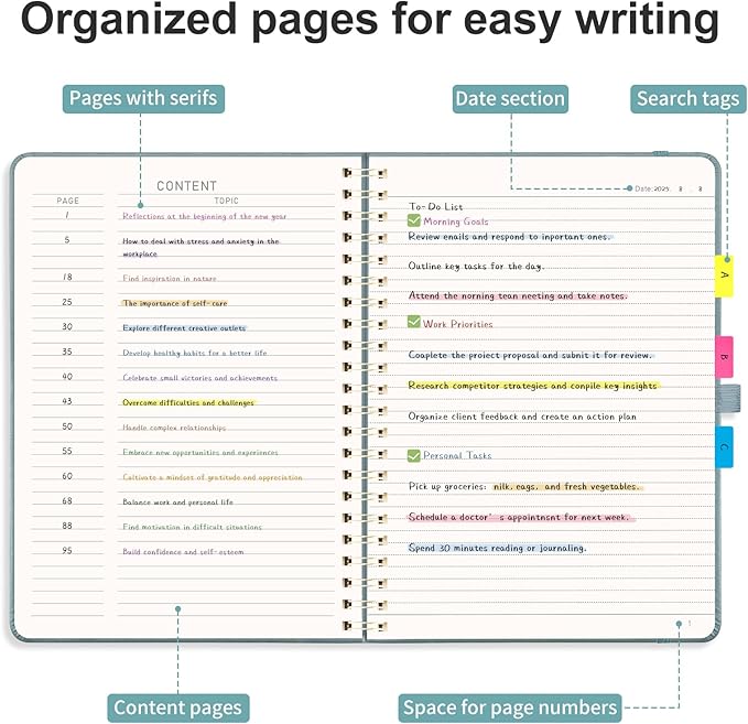 - ORGANIZED AND PRACTICAL NOTEBOOK: Our lined spiral notebook features 110 numbered pages and 4-page blank table of contents. In a large A4 size 8.5" x 11", providing ample writing space while remaining lightweight and easy to carry