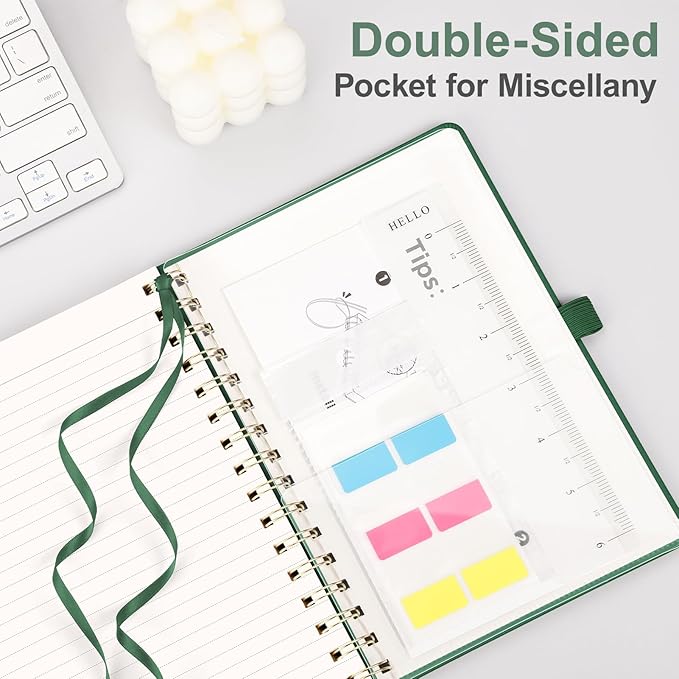 - PRACTICAL LAYOUT: Equipped an elastic band, a pen holder and removable bookmark ruler to keep your notebook organized. Comes with a DIY bookmark with a ribbon for self-attachment to the spiral, serving as a bookmark. Features a double-sided pocket for storing miscellany and 18pcs sticky notes for additional organization and reminders