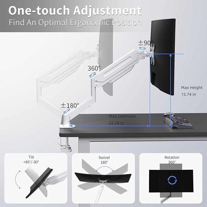 - Full motion - Easy height adjustment, rotate 360°, tilt ±80° up and down, swivel ±180° left and right.