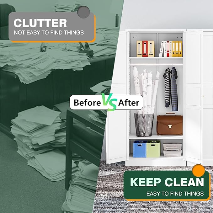 - Spacious and Flexible Storage: 72H×36W×18D. This tall wardrobe has a large interior with a dedicated hanging rod area and adjustable shelves. The large storage capacity allows you to organise clothes, accessories, office supplies and more, increasing the functionality and flexibility of your space.