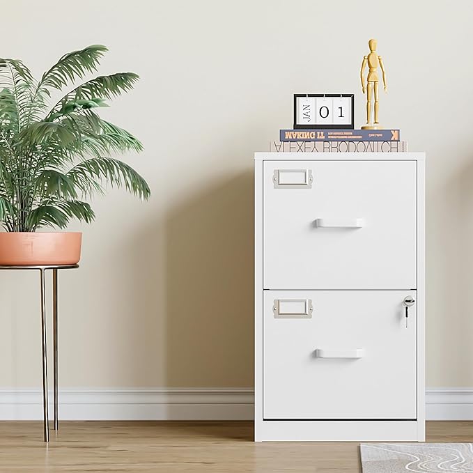 2 Drawer Vertical File Cabinet with Lock, White Metal, Under Desk, Easy Assemble