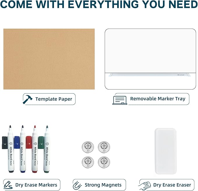 - 【ACCESSORIES INCLUDED】: The package includes 4 dry erase markers, 4 magnets, 1 glass whiteboard eraser and 1 removable aluminium marker tray for mounting. One-stop shopping. It's a great gift idea for your workmate, boss or spouse which can enhance the office/ house atmosphere