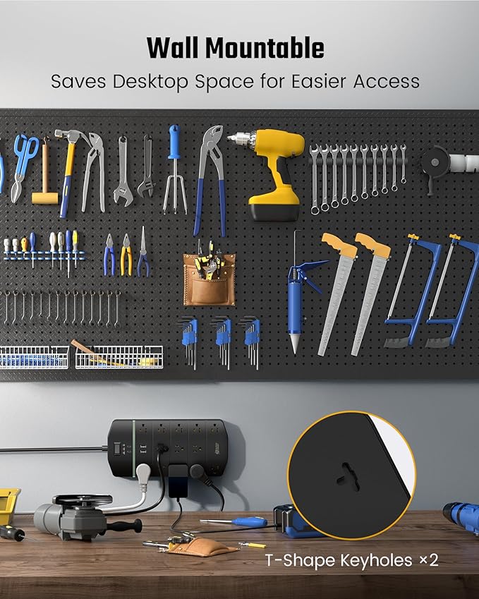 - Space-Saving Design: A clean workspace is essential for efficiency and productivity. A 45° flat plug is meticulously designed to fit in tight spaces behind the workbench or furniture, while leaving the bottom outlet usable. Screws and a drill template are included for you to easily wall-mount the power strip for easier access to power.