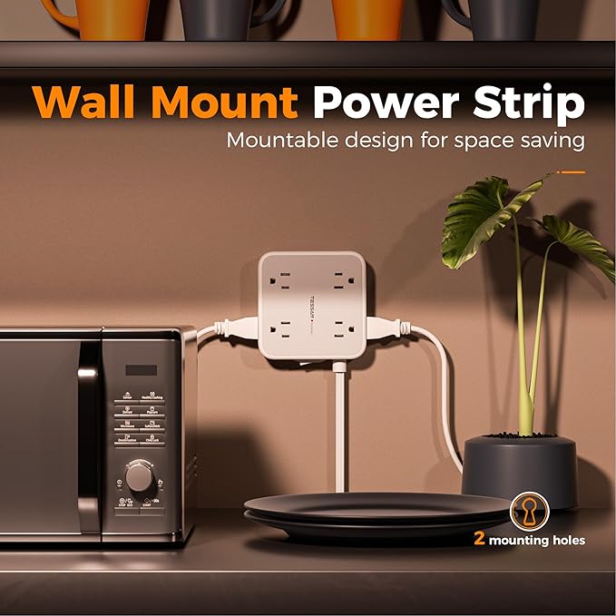 - Mountable Power Strip: The wall mount power strip with 2 mounting holes design can easily mount on the wall, no more worrying about cluttered cables and reducing the desktop space; 4 rubber feet on the bottom effectively prevents slipping and sliding