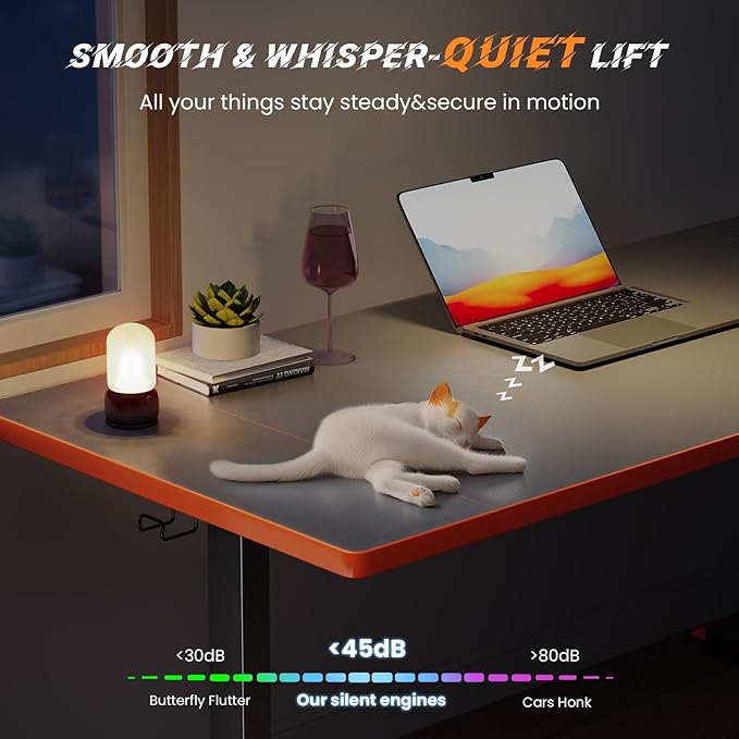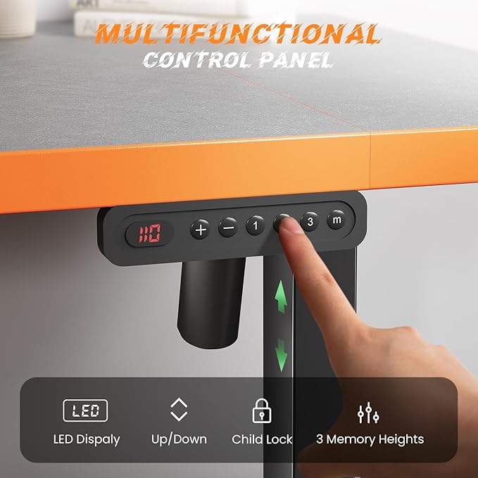 - Customized Sit Stand Desk : The reliable motor operates quietly (under 45 dB)and smoothly, all your things stay steady&secure in motion. The intuitive control panel allows you to preset 3 preferred heights, switch between sitting and standing positions has never been easier. Child lock for total peace of mind.