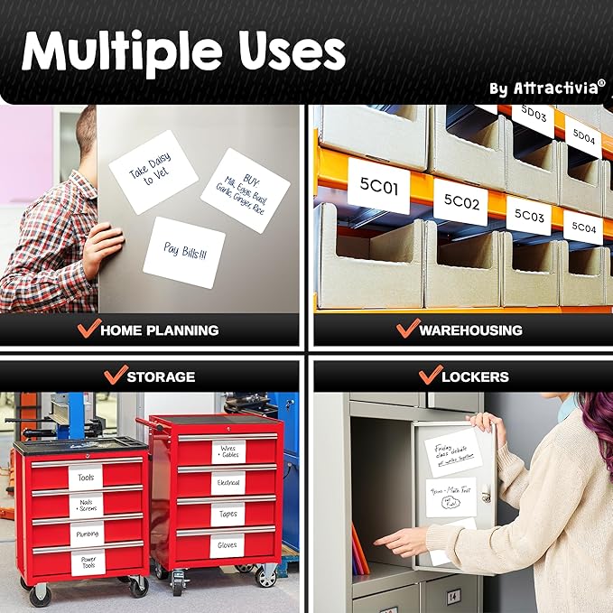 - Rewritable 100,000+ Times: Unlike flimsy labels that degrade over time, our white board magnetic labels are engineered to be erased and rewritten over 100,000 times without losing quality. The advanced coating prevents ink buildup, so every wipe restores a brand new surface, saving you money while reducing waste!