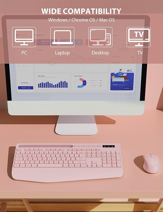 - BUILT FOR COMFORT - Ergonomic keyboard designed with a generous palm rest and tilt legs, offers a better typing position to reduce the pressure on your wrist. The wireless mouse provides total comfort with a perfect handshake angle, contoured grips and premium matte finish.