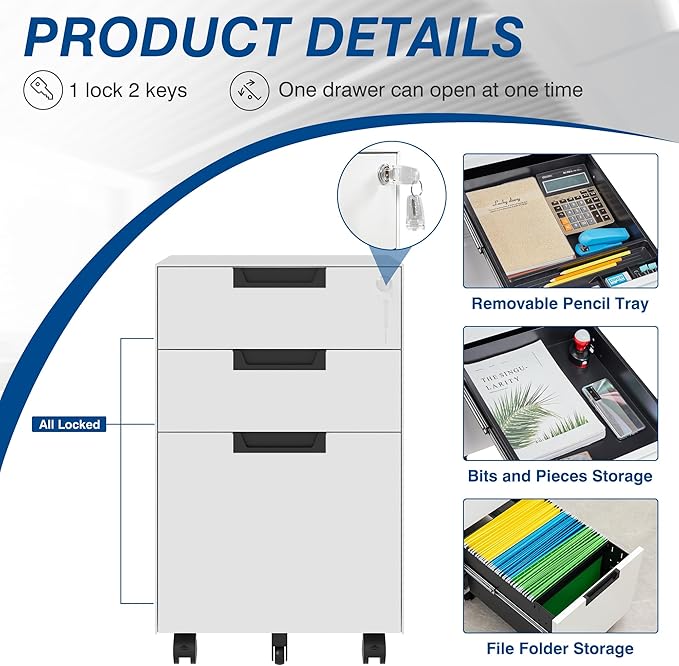 - CAN BE PLACED EVERYWHERE - Thanks to the compact design and five flexible wheels of this filing cabinet, you can easily putting it under the desk, next to the sofa, in the bedroom to using as a under desk file cabinet, a bedside tables etc.