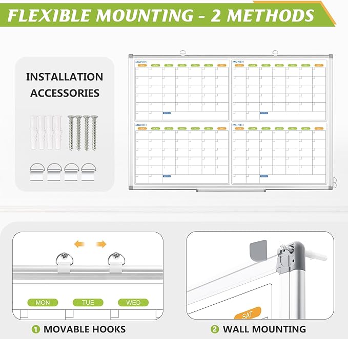 - 【2 Simple Installation Methods】: 𝑴𝒆𝒕𝒉𝒐𝒅 1 - Use the sliding hooks equipped with the calendar whiteboard for wall to hang directly to the wall; 𝑴𝒆𝒕𝒉𝒐𝒅 2: Use the screw holes on the corners of the frame to install. It comes with covers so it would look super clean with no visible screws. Installation is very simple and flexible, it can be hung horizontally or vertically according to your needs